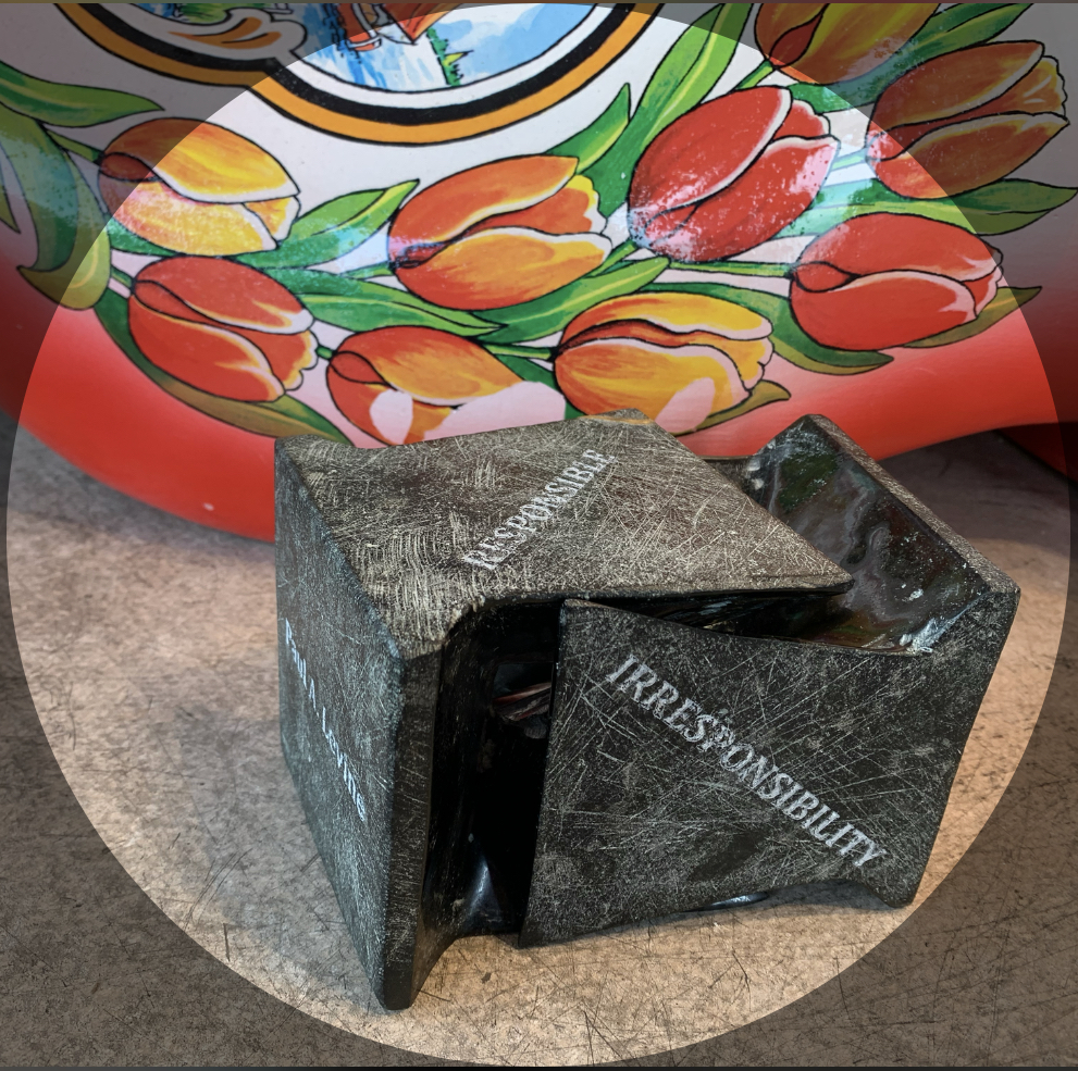 A Traveling Tombstone “Tevat Paul“ in Amsterdam. Sculptor: Robert Schmidt-Matt. Engraved: “RESPONSIBLE IRRESPONSIBILITY – Paul A. Levine”.