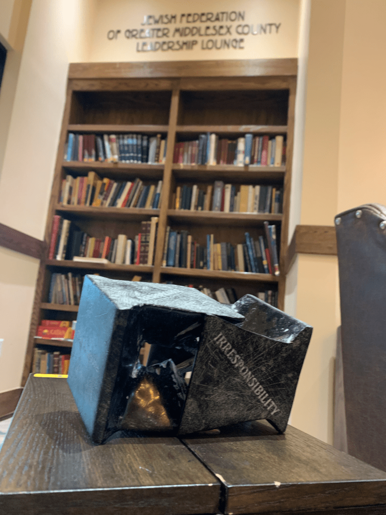 A Traveling Tombstone โTevat Paulโ visited Prof. Dr. Frank Chalk, Department of History Concordia University, Montreal QC, Canada. Series: โZweisamโ; Sculptor: Robert Schmidt-Matt. Material: Diabas, 10 x 10 x 12 cm. Engraved: โRESPONSIBLE IRRESPONSIBILITY – Paul A. Levineโ.